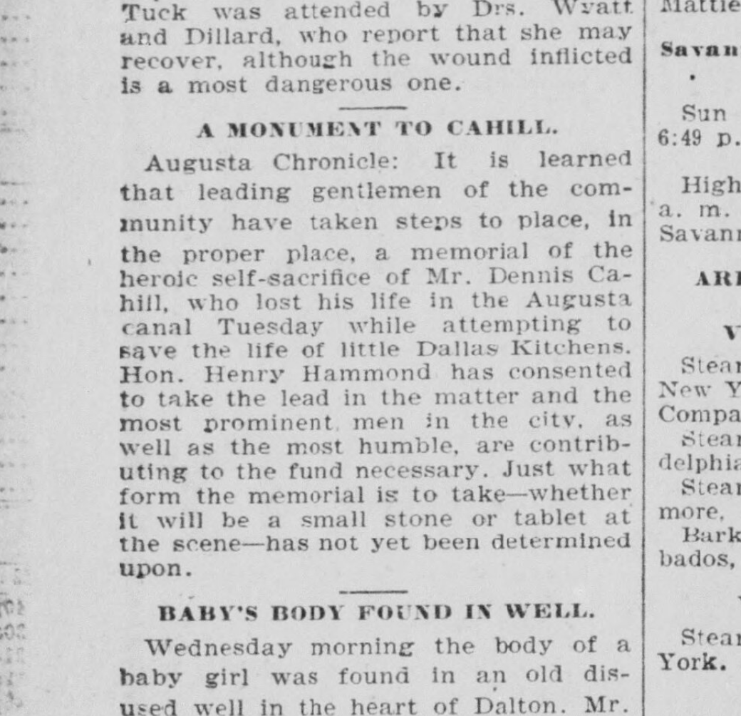 “Leading gentlemen of the community have taken steps to place… a memorial of the heroic self-sacrifice of Mr. Dennis Cahill, who lost his life in the Augusta canal while attempting to save the life of a young child.”
