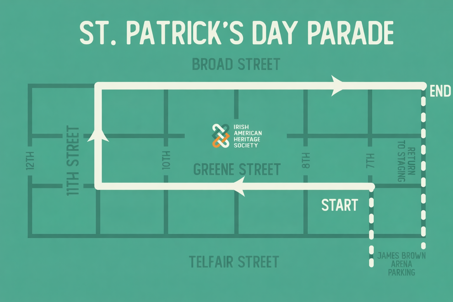 Each year, the Irish American Heritage Society organizes and facilitates the St. Patrick’s Day Parade in downtown Augusta, GA. Please note - the parade route has been submitted to the City and is pending final approval.